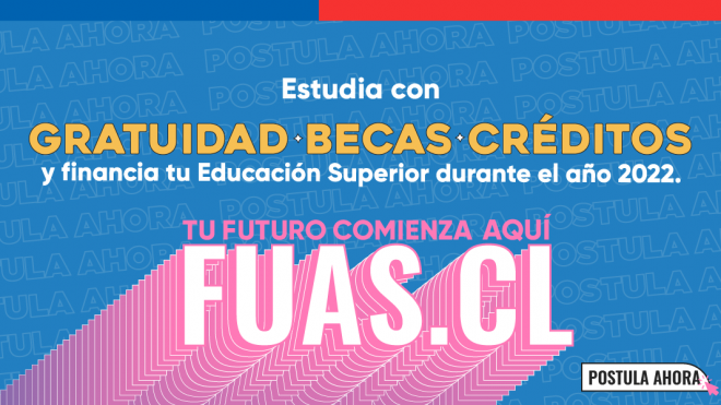 Este martes el Ministerio de Educación abrirá el proceso de postulación a la gratuidad, becas y créditos para la Educación Superior 2022, el cual se extenderá hasta el 26 de octubre. En este proceso los estudiantes que el próximo año quieran ingresar a centros de formación técnica, institutos profesionales o universidades, y aquellos que ya están cursando una carrera y no cuenten con ayudas estudiantiles o quieran optar a una mejor podrán completar, a través de su celular, tablet o computador el Formulario Único de Acreditación Socioeconómica (FUAS) en www.fuas.cl y así estarán postulando a los beneficios estudiantiles que ofrece el Estado.